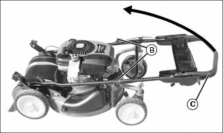 5. Loosen knobs (B) enough to allow upper handle (C) to pivot toward the rear, over the mower.