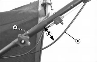 5. When unfolding handle, be certain that the loop in the traction drive cable (D) is not removed by pulling on cable. Be certain that there is a minimum distance of 10 cm (4 in.) (E) of center of loop between cable (D) and upper handle (A).