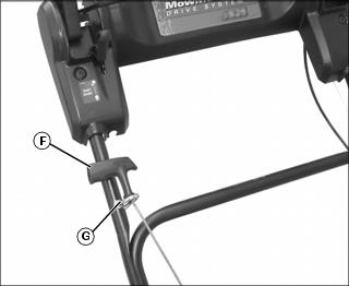 7. While squeezing the operator presence control down against the drive handle, slowly pull starter handle (F) up to rope guide (G) located on right side of upper handle as shown, and hook rope through guide.