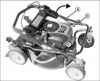 2. Unfold upper handle (A) toward front of machine until upper handle aligns with and fits into lower handle (B). Securely tighten upper handle knobs (C) on both sides.