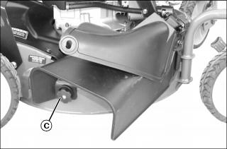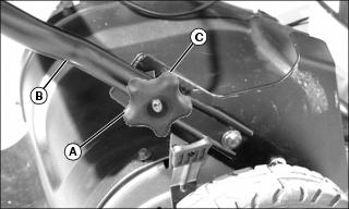 1. Remove plastic knob (A), lock washer and carriage bolt securing lower handle (B) to mower deck bracket (C) at each side of mower deck. For first time set-up remove knob, washer and carriage bolt from pre-assembly position in mower deck brackets.