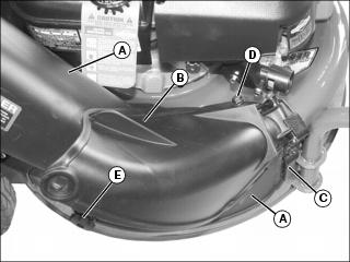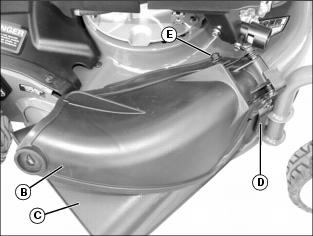 4. Install side discharge deflector (C) below side discharge cover (B) and align lower mounting tab on outside front of deflector under side discharge cover hinge bracket arm (D).
