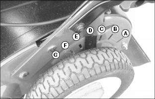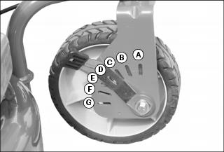 2. Set all wheels at the same cutting height. The highest cutting height is location G. The lowest cutting height is location A.