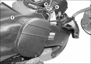 1. Open adapter door (F), grasp grass bag connector handle (G) and slide grass bag connector (H) down over adapter flange to secure. Release adapter door to rest against grass bag.