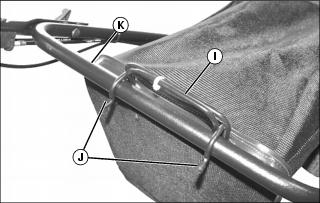 2. Grasp grass bag handle (I), pull grass bag back and position grass bag hooks (J) over lower handle cross bar (K).
