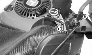 3. Pull operator presence control back to the drive handle, pull starter cord (L) out, route to pulley (M), mounted on grass bag adapter, and up to rope guide located on right side of upper handle.