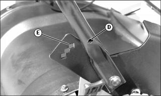 5. Install slot on inside front of deflector under restraining nut (E) on top of deck (under right front corner of engine).
