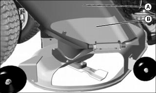 4. With a tape measure or ruler, measure the left rear and right rear edge of the mower deck at points (A). If the two measurements are not equal, turn the leveling nut (B) on each rear lift link to adjust. Repeat procedure until rear corners of the mower deck are level.