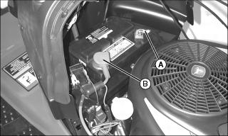 3. Push red cover (B) away from positive (+) battery terminal and remove cable from battery.