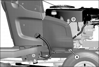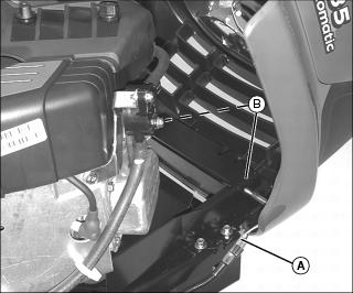 2. Loosen retaining screw (A) and flat washer securing lower front corner of closeout panel (B) to frame.