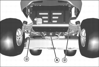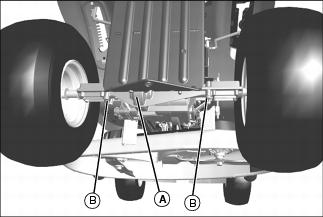 2. Safely lift and support machine. Place safe lifting device under end of front hanger bracket at location (A), and place jack stands or other stable supports under frame on each side at location (B). Block wheels remaining on the ground to prevent machine movement.