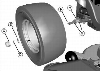 2. Install rear wheel, washer (E), snap ring (D) and plastic cap (C).