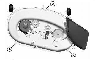 4. Place three short 51 mm (2 in.) blocks of wood under the edges (A) of the mower deck.