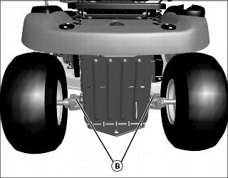 • If the rear of the mower deck is not touching the rear blocks, or is sitting heavily on the blocks, adjust the rear lift links by turning the leveling nut (B) on each lift link. The blocks should be able to easily slide in and out beneath the mower deck when the mower deck is correctly adjusted.