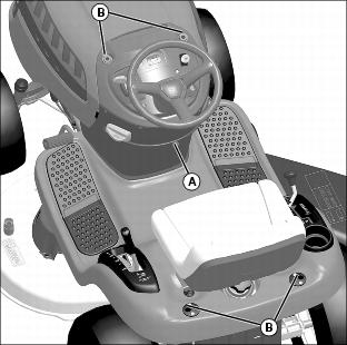 4. Check each mower wheel position. Remove nut (A) and bolt (B), and move mower wheel to proper hole.