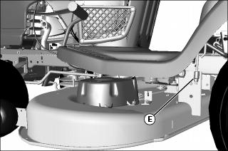 c. Adjust mower deck level, if necessary, by turning rear nuts (E) clockwise to raise the side of the mower deck, or counterclockwise to lower the mower deck.
