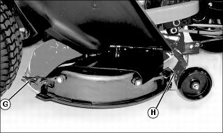 c. Adjust mower deck level, if necessary, by turning the nut (G) counterclockwise to lower the front of deck or clockwise to raise front of deck.