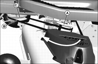 6. Sujetar el brazo de tiro trasero (A) y la articulación de elevación ajustable (B), en cada lado, con arandelas y pasadores de bloqueo por resorte (C).