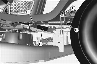 5. Retirar los pasadores de bloqueo por resorte y las arandelas (F) y desconectar el brazo de tiro trasero (G) y las articulaciones de elevación ajustables (H) de cada lado.