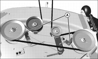 4. En máquinas de 107 cm (42 in.), desconectar el cable de transmisión del accionamiento del cortacésped (A), situado en el lado izquierdo de la plataforma de corte.