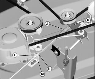 a. Pasar el cable bajo la correa del cortacésped y la varilla del freno, y acoplar el resorte del cable (J) al soporte de la polea tensora (K).