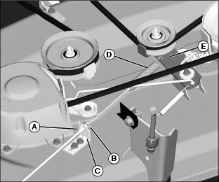 b. Retirar el resorte del cable (D) del soporte de la polea tensora (E).