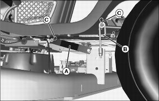 5. Si es necesario hacer un ajuste, girar la tuerca (C) al final de la varilla del freno en la dirección correcta para colocar el freno a la distancia correcta de la polea.