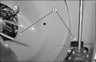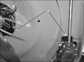 If top ground speed of the mower has decreased due to belt stretch or wear, the drive cable (C) must be adjusted to increase belt tension.