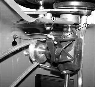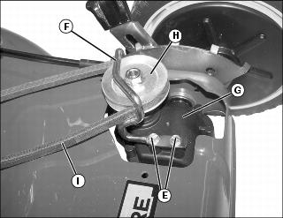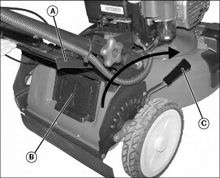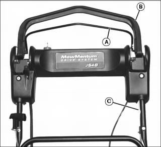 This occurs because the drive handle is connected to the traction drive belt tensioning mechanism by a cable (C) that runs under the left side of the handle assembly. As the drive belt wears, belt tension decreases, and ground speed at a given drive handle position changes.