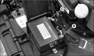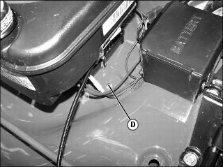 2. Install red positive battery cable connector (D) with hardware removed earlier.