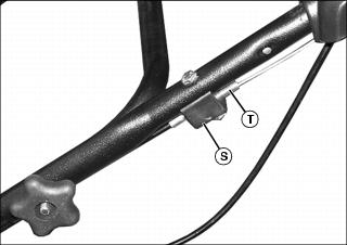 When the operator presence control (A) is held back against the drive handle (B), and the drive handle is moved forward, the drive system is engaged. Pushing the drive handle further forward increases the ground speed. Pulling the drive handle back decreases ground speed and will ultimately disengage the drive system.