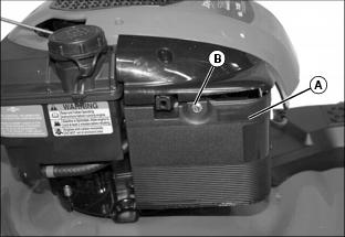 2. Loosen screw (B) and tilt cover down against side discharge cover.