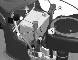 3. Push red cover (B) away from positive (+) battery terminal and remove cable (C) from battery.