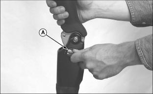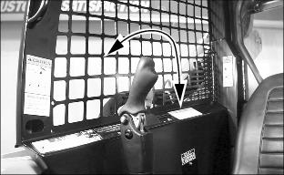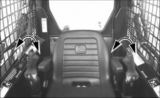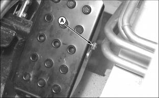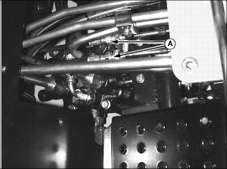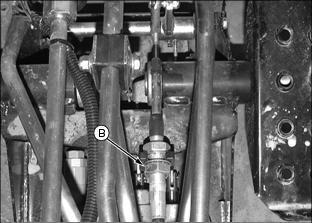 Service Steering & BrakesAdjusting Auxiliary Hydraulic Control Handle LinkageThe auxiliary hydraulic hand control linkage goes down through the right control lever to the control valve. 1. Park machine safely. (See Parking Safely in the SAFETY section.) 2. Lock boom in the raised position. 4. Rotate control lever handle all the way up and all the way down. Ensure that the valve locks into detent. 5. Confirm that when handle is returned to the neutral position, the locking mechanism (A) will engage without movement of the handle. 6. If necessary, adjust position of cable forward or backward using nuts (B) to properly position the handle. 7. Install center cover plate and lower boom to ground. Adjusting Boom and Bucket Hand Control Linkage1. Park machine safely. (See Parking Safely in the SAFETY section.) 2. Lock boom in the raised position. 4. Rotate each control lever handle all the way up and all the way down. Ensure that boom control valve locks into detent. 5. Confirm that when handles are returned to the neutral position, they are in the center of the operating range. 6. If necessary, adjust positions of cables forward or backward using nuts (A) to properly position handles. 7. Install center cover plate and lower boom to ground. Adjusting Angle of Boom and Bucket Foot PedalsThe angle of the foot pedals can be adjusted to suit different operators or different footwear which affects foot position. |
