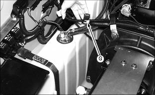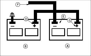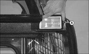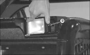 5. Charge battery according to the instructions on the battery charger or in the charger operator's manual. Using Booster Battery1. Connect positive (+) booster cable to booster battery (A) positive (+) post (C). 2. Connect the other end of positive (+) booster cable to the disabled vehicle battery (B) positive (+) post (D). 3. Connect negative (-) booster cable to booster battery negative (-) post (E). 4. Connect the other end (F) of negative (-) booster cable to a metal part of the disabled machine frame away from battery. 5. Start the engine of the disabled machine and run machine for several minutes. 6. Carefully disconnect the booster cables in the exact reverse order: negative cable first and then the positive cable. Replacing FusesReplacing Fuse for Accessories, Seat Switch, and Key Switch:1. Locate fuse panel cover (A) in operator's station on right side. 3. Pull bad fuse out of socket. 4. Check metal clip (B) in fuse window. Discard fuse if clip is broken. 5. Push new fuse into proper socket. Be sure new fuse is the same amperage as removed fuse. Replacing Fuse for Optional Heater/Defroster:1. Park machine safely. (See Parking Safely in the SAFETY section.) 2. Raise ROPS and ensure ROPS is safely in the locked position. 3. Locate 15 amp heater/defroster fuse (A), found on the heater/defroster engine wiring harness located over the engine flywheel housing. 5. Check metal clip in fuse window. Discard fuse if clip is broken. 6. Push new 15 amp fuse into socket. Be sure new fuse is the same amperage as removed fuse. Replacing Fuse for Optional Backup Alarm:1. Park machine safely. (See Parking Safely in the SAFETY section.) 3. Locate 10 amp backup alarm fuse (G), found on the backup alarm wiring harness located between the skid steer fuse block and engine flywheel. 5. Check metal clip in fuse window. Discard fuse if clip is broken. 6. Push new 10 amp fuse into socket. Be sure new fuse is the same amperage as removed fuse. Replacing Work Light Bulb (Front or Rear)