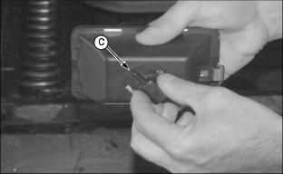 6. Electrolyte (B) should be 6 mm (1/4 in.) above plates (C). 7. Add distilled water, if necessary, to battery cells. 9. Install left side panel, close engine cover, and rear service door. Charging the Battery1. Park machine safely. (See Parking Safely in the SAFETY section.) 3. Allow battery to warm to room temperature.