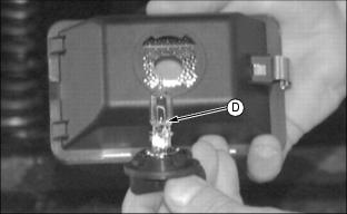1. Park machine safely. (See Parking Safely in the SAFETY section.) 2. Push the light housing (A) on the notched side to compress the spring clip. 3. Pull the housing (B) out of the ROPS frame. Disconnect wire harness. 4. Twist the bulb retainer (C) counterclockwise turn. Remove retainer. 5. Discard old bulb (D), insert new bulb into retainer. 6. Place retainer in housing and turn clockwise turn. Connect wire harness. 7. Place spring clip in ROPS frame housing. Push to compress spring and pivot light housing into frame. |