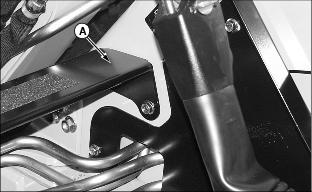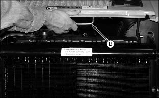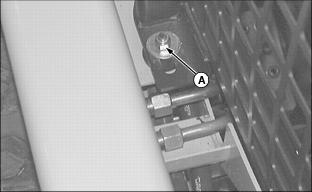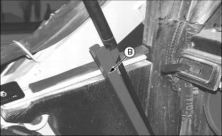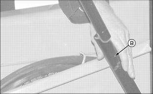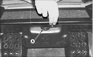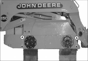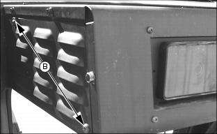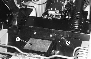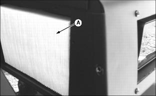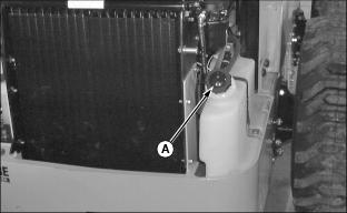 6. Fill tank only to bottom of filler neck. Capacity is 76 L Raising and Blocking Skid Steer1. Park machine safely. (See Parking Safely in the SAFETY section.) Picture Note: Wheels removed for photo clarity 2. Use a safe lifting device to raise skid steer. Use jacking points (A) to jack skid steer. 3. Lower skid steer onto blocks. Removing and Installing Skid PlateRemoving Skid Plate1. Park machine safely. (See Parking Safely in the SAFETY section.) 2. Locate skid plate at rear underside of frame. 3. Remove nine cap screws securing skid plate to frame. Installing Skid Plate1. Install skid plate using nine cap screws. 2. Tighten cap screws to 41 N·m (30 lb-ft). Filling Windshield Washer Bottle (If Equipped)1. Park machine safely. (See Parking Safely in the SAFETY section.) 2. Open cap (A) on windshield washer bottle. 3. Fill bottle with a 50/50 mix of windshield wiper fluid and water. 4. Close cap (A) on windshield washer bottle. Cleaning and Replacing Heater/Defroster Air Filter (If Equipped)1. Park machine safely. (See Parking Safely in the SAFETY section.) NOTE: The heater contains an air filter element (A) in left side of heater assembly. 2. Check air filter element (A) periodically especially if running in dirty applications. 3. Remove filter element by removing two screws ( B) and shield from left side of heater assembly. 4. The filter element can be blown off with a low pressure air gun and reused or replaced. The element must be placed with the rubber seal toward the heater core. |