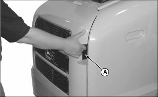 Service MiscellaneousOpening and Closing Rear Service Door1. Park machine safely. (See Parking Safely in the SAFETY section.) 2. Pull latch (A) up to release door. Pull back on door to open it. 3. To close door, push door closed until latch closes. NOTE: A padlock may be used to lock engine compartment. Opening and Closing Engine CoverOpening engine cover:1. Park machine safely. (See Parking Safely in the SAFETY section.) 3. Lift engine cover latch (B) up to release latch. Closing engine cover:· Lower cover letting latch slide into slots on each side. Removing Engine Side Panels1. Park machine safely. (See Parking Safely in the SAFETY section.) 2. Open rear service door and engine cover. 3. Lift side panel up and remove from skid steer. Removing Left Side Panel To Service:Removing Right Side Panel To Service:Removing Cover Plates1. Park machine safely. (See Parking Safely in the SAFETY section.) 3. Raise boom and set on boom locks. 4. Turn key switch to off position. 5. Raise and lock ROPS in up position. 6. Remove toe guard shielding (A). 7. Remove step (B) and cover (C). Raising ROPS (Roll Over Protection Structure)1. Park machine safely. (See Parking Safely in the SAFETY section.) 2. Lower boom to full down position. NOTE: ROPS can be raised with the boom resting on the boom locks. 3. Remove nuts and washers (A) (one on each side). 4. Using hand holds, raise ROPS, making sure steering levers fall forward. Continue raising ROPS all the way up so that gas spring cylinder locks in place. 5. Ensure ROPS cylinder is locked by pushing down on lower cylinder tube (B). 6. To lower ROPS, push lower cylinder tube (C) up to unlock cylinder. 7. Pull ROPS down until seated on mounting studs.
