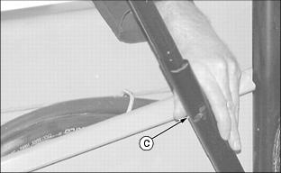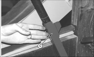8. Install washer and nut on ROPS mounting stud (one on each side). Tighten hardware to 140 N·m (105 lb-ft). Raising ROPS (Roll Over Protection Structure)1. Park machine safely. (See Parking Safely in the SAFETY section.) 2. Lower boom to full down position. NOTE: ROPS can be raised with the boom resting on the boom locks. 3. Remove nuts (A) (one on each side). 4. Using hand holds, raise ROPS, making sure steering levers fall forward. Continue raising ROPS all the way up so that gas spring cylinder locks in place. 5. Ensure ROPS cylinder is locked by pulling forward on red cylinder lock (B). 6. To lower ROPS, push red cylinder lock (C) rearward to unlock cylinder. 7. Pull ROPS down until seated on mounting studs.