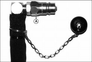 1. Position drain pan and remove male coupler (A) from 90° elbow on backhoe pressure hose.