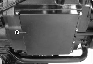 11. On ePowrReverser and eHydro models: Remove cover (F) under center of machine.