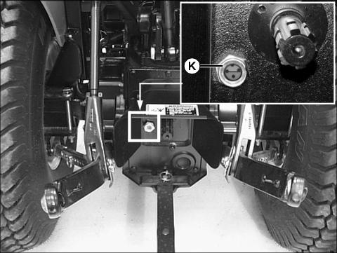 22. Add preferred transmission oil or equivalent into fill opening until oil level reaches mid-level range on the sight glass (K).