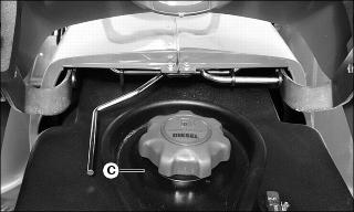 · If fuel is spilled, raise hood and clean overfill reservoir (C).