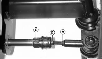 2. Rotate adjuster (B) while holding hex nut (C) to lengthen or shorten each tie rod. Adjust each tie rod equally until toe-in measurement is within correct specification.