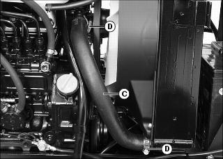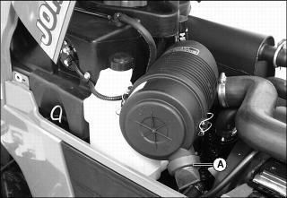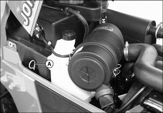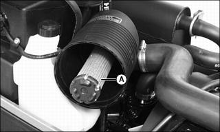 3. Remove air intake hose (A) from opening between the grille and radiator.