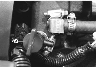 2. Locate petcock drain (A) behind the brake pedals or travel pedals on the right side of the machine.