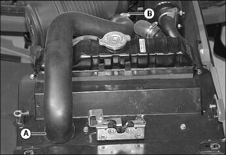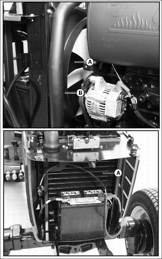 6. Remove all dirt and debris from radiator fins (A) and fan shroud (B) using compressed air or water.