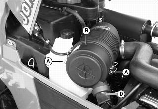 6. Install air cleaner canister cover (B) with rubber dust unloading valve (D) pointing downward.