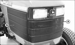 1. Check grille (A) and both side panel screens (B) for dirt, grass clippings and debris.